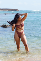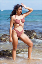 Get drenched in the sun with the Mirage. A stunning one-piece bikini that gives you a tan in all the right places. It features a gathered bikini top with crisscross straps connected to the high cut bottoms. The bikini bottoms have gentle rouching to keep the details exciting.